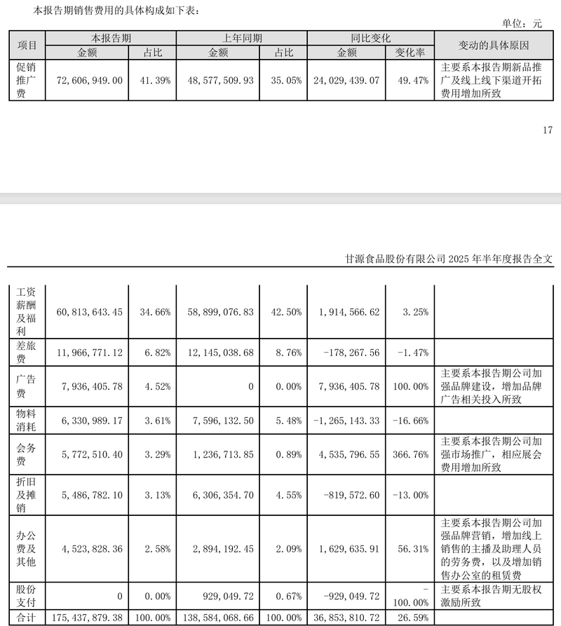 Ganyuan Food提供了一项资格投票,上面称“净收入和收入年复一年”,当时利润在2025年上半年下降。收入约为9.45亿元人民币,上一年的9.34%降低了。造成贸易公司股东的净收入约为746.6亿元人民币,比上一年减少了55.20%,表明“一半”。记者发现,Ganyuan食品表现的下降受多种因素的影响。原材料成本的年度增长,产品销售量表的减少以及运营费用的年度增加。其中,销售成本约为1.75亿元人民币,比上一年增加了26.59%,这使其特别引人注目。根据Ganyuan Food的说法,TheCompany于今年1月正式宣布其品牌发言人,指挥了一系列的营销和品牌推广活动。市场反馈效应很好,并达到了一定的计费率,但是仍然不可能阻止公司获得收入和净收益下降。另一个不一致的在于渠道扩展与终端销售之间的差异。食品Ganuan的净销售年复一年增加了354个分销商,但总数超过3,100,终端销售放缓。在下半年的最大销售季节之前,Ganyuan Food表示,他将采取积极的措施进一步提高其新的和中央产品的销售规模。净收入和收入年复一年。丁·尤克西(Ding Yuxi)已正式宣布为品牌发言人。 Ganyuan Food是一家现代制造公司,融合了Teresearch,三明治的生产和销售。它的主要产品包括绿豌豆,瓜籽谷物,各种豆类,整体豆,整体螺母,味道坚果,花生,炸土豆,米饭,sc饼,结av和其他小吃s。在2025年上半年,Ganuan Foods的运营收益约为9.45亿元人民币,与上一年相比下降了9.34%。造成贸易公司股东的净收入约为746.6亿元人民币,与上一年相比下降了55.20%。扣除未重复的利润和亏损后,归因于所引用的公司股东的净收入约为635.276亿,比上一年的股票高出56.01%。关于绩效变化的原因,甘努安食品(Ganyuan Food)表示,在报告期间,由于降低和收入量表的减少和原材料成本(例如棕榈油),毛利润降低了,年际降低。记者在今年上半年意识到,加努安食品的坚果和豆类的整体果实的运营收入,绿叶系列,瓜籽内核系列和其他系列均年复一年,而RE则是REBroad Bean系列的场地年复一年增长2.11%。同时,为了促进品牌和产品的更新,加强国家和外国营销渠道的建设并提高市场竞争力,该公司在报告期间增加了对明星支持,广告,新产品的促销,在线和外线渠道开发以及销售成本上升的投资。记者注意到,今年上半年Ganuan Foods的销售成本约为1.75亿元,比上一年增长了26.59%。其中,广告率在去年上半年为0元,今年上半年约为79.364亿元。此外,会议率的提高也非常大,今年上半年增加了约57.725亿元人民币,意图增加了366.76%,这主要是由于市场的加强市场促销和Correspo的增加。展览。今年上半年的销售费用。该品牌发言人Ganyuan Foodwechat的官方帐户是今年1月7日的财务报告的屏幕截图。 In April of this year, Ganyuan Food said: “The company officially announced its brand spokesman in January, carrying out a series of brand marketing and promotion activities to shape the younger brand image,Attract younger consumers and even more strengthening brand consciousness and exposure to products. Ganuan kitchen management expenses for the first half of this year. To improve the level of management in financial reports, Ganyan, a management team and more management team. Management expenses increased by 24.20% during the previous year during报告期是对80年代和90年代的无数童年的记忆NDWICHES在广东省的东圭恩(Dongguan)销售实现了烤基本产品市场的商机。 2000年,他在广东省的帕尤(Panyu)创立了一家小型食品工厂,他的业务迅速从嘴到嘴蔓延。 2006年,杨·宾舍(Yang Binsheng)在扬西(Yangsi)的平克森(Pinkishun)的家乡建立了甘旺(Ganyuan)餐。自该公司成立以来,Ganuan Foods始于Pinxiang,Pinxiang是位于Hunan和Jiangxi交汇处的一个小城市,逐渐从中国到世界。 Ganyuan Food遵守商业策略“所有渠道 +多个类别”,其销售主要使用“分销 +电子商务 +直接销售”的合并销售模型。 Ganuan Foods将其在中国东部,中国南部,中国西北部,中国西北,中心,中国东北,中国,中国西北和国外划分其销售市场。从经销商的分配来看,中国有949家公司,有561家公司处于中心中国有38家公司,共有38家公司。今年上半年,Ganyuan食品分销商的情况。今年6月底的财务信息的屏幕截图,Alim经销店的总数为3,115,比上一年增加了12.82%。其中,国外的地区一年增加了90%,这主要是由于该公司在国外市场的积极扩张以及客户数量的增加。据了解,Ganyuan Food正在国外逐渐发展其市场,主要是通过东南亚,加强了国外的渠道,并与出口商一起加强了团队的建设。 2024年,甘尼亚食品国外商业收入的增长显着更高,其最佳销售产品包括一系列坚果和水果的全面产品。分销商的数量正在增加,但公司产品的销售并不令人满意。记者有宣布埃德(Ed),在今年上半年,记者将展示一系列坚果和豆类,绿豌豆系列,宽阔的豆豆和米尔龙豆Rie。所有系列和其他Nucleus系列都注意到,生产和销售量逐年减少,库存量逐年增加。 “该公司正在实施基于销售的生产。在报告期间,Bean内核和水果系列的行动已变化超过30%,这主要是由于产品销售的减少。” Ganyuan Food说:“广泛的豆类库存同比增长了30%以上,这主要是由于在此报告期间产品销售的下降,以及在同一期刊上的比较数据的少量基础,” Guosheng Securities在研究报告中注明:“经验丰富的渠道转型阶段:“经验丰富的渠道转型阶段,直接超市和海外的序列阶段是在阶段扩展的。季节性消费。它正在采取积极措施,以进一步改善新的和中央产品的销售规模,增强内部控制,提高