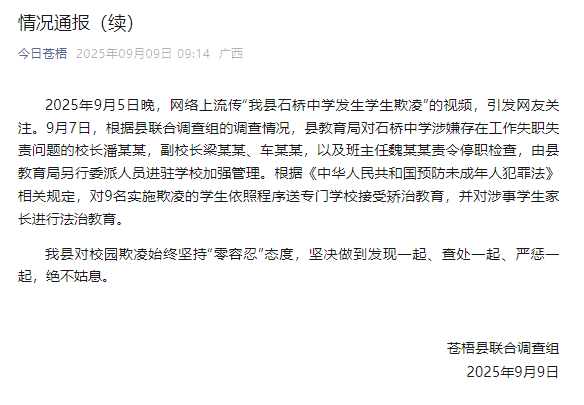 北京新闻于9月9日,坎格县联合研究小组发表了有关这种情况的报告。 2025年9月5日晚上,在线流传了一段“在我们县的Shiqiao高中发生骚扰”的视频,引起了互联网用户的关注。 On September 7, the County Education Department ordered the alleged prime minister who had the task of abolishing the duties and duties at the Shikiao intermediate school, with Deputy Moo Moo, Vice Director Choi Moo Moo Moo Moo Moo and the class teacher Wei Moo Moo Moo Moo His To Appoint Duties To Appoint Duties To Appoint Dut Duties To Appo duties to appoint duties to appoint duties to appoint duties to appoint duties to appoint duties to任命任命职责任命职责的职责的职责任命任命职责任命职责的职责的职责负责任命Appoin职责的职责任命职责,要求指定职责指定职责,以指定指定任务,以指定职责指定职责以指定职责以指定指定职责指定职责以指定指定职责的职责,以指定指定指定指定职责的指定职责。任命任命义务根据中华民国法律的相关规定指定职责,以防止轻度犯罪,九名欺凌的学生根据程序将两家派往职业学校进行惩教教育,而所涉及的学生的父母则受到法律教育。我们的县一直坚持对欺凌的“零容忍度”的态度,我们坚定地向您保证,每次被发现,调查和受到严厉惩罚时,都会对其进行调查和惩罚。相关阅读:广州·坎格报道说:高中生击败了学生。”