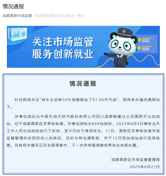 北京新闻于8月21日,成都高科技区的市场监督和控制办公室发布了一份国家报告,以应对互联网的担忧,即“一些汽车所有者报告说已将67.96升汽油添加到50升燃油箱中。”所涉及的服务站是高科技Angshan Gazkee站,River Change Rama de China Oil放置。涉及的燃油枪是燃油枪06#。 2025年8月9日事件的那天,人员密封了燃油枪,但仍在使用。 11月,在收到原告的报告后,Fangcao街市场的监督和管理办公室及时与他进行了沟通,并于12日去了服务站进行检查。相关情况目前处于整体研究之下,下一步是Abthey将根据调查结果根据法律和法规命令。 XIN JING编辑