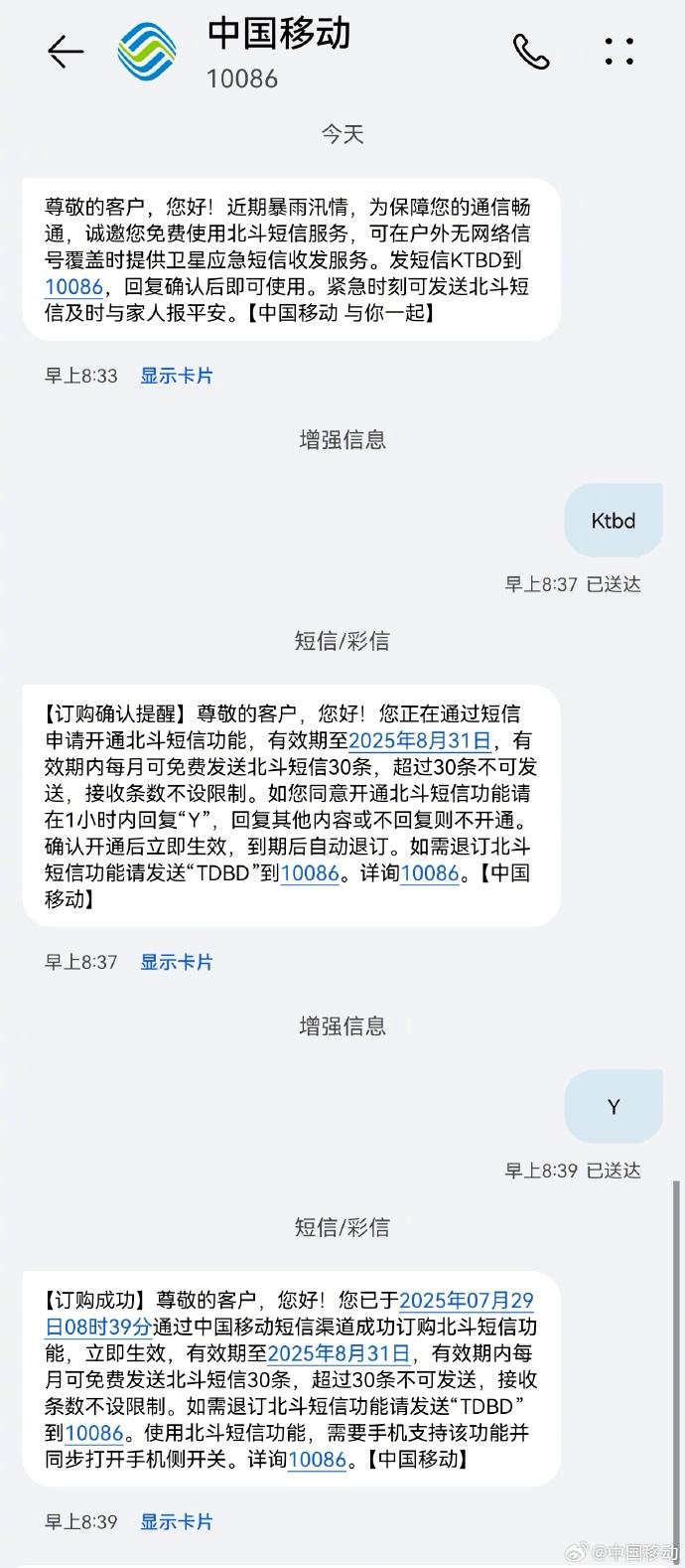 根据中国手机,北京新闻,大雨和洪水经常发生。为了确保没有问题的沟通,中国移动一个月为北京用户提供贝多·SMS服务(发送30条消息以接收无限招待会)。当没有户外网络信号时,通过手机发送和接收紧急短信,该手机接纳Beidou SMS的功能,这可以帮助用户在紧急情况下与家人报告安全性。在这里,我们向您展示如何使用它:将短信“ KTBD”发送到10086,并在响应和确认后使我启用。如果您处于紧急情况下,例如户外移动通信网络的覆盖范围,则可以使用此服务发送Beidou SMS来传达您的帮助或安全消息。目前,中国流动将许多部队派往具有严重洪水条件的地区,以救援和部署空军基地,以向房屋提供紧急通信服务。 Liu Jiani编辑