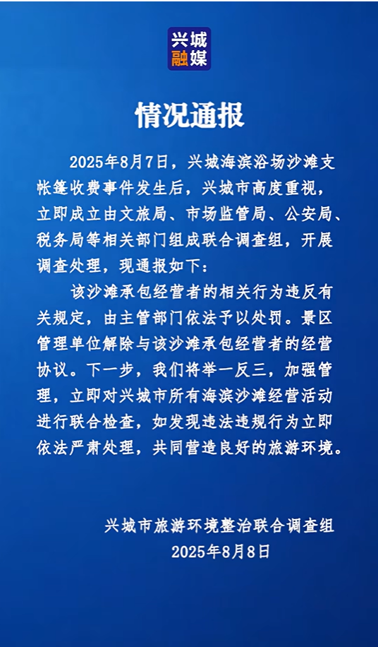 北京新闻于8月8日,关于改善艾恩省福尔多的Xingccheng旅游环境的联合研究团队通过Xingccheng Media Center发布了一份国家报告。详细信息:根据以前的媒体报道,利港的IP Internet用户于8月7日建立了一家商店,去了Huludao的Binjawan Beach播放,该男子前进了。另一方说,海滩已经签署了自己的合同。 Chen Yanting编辑